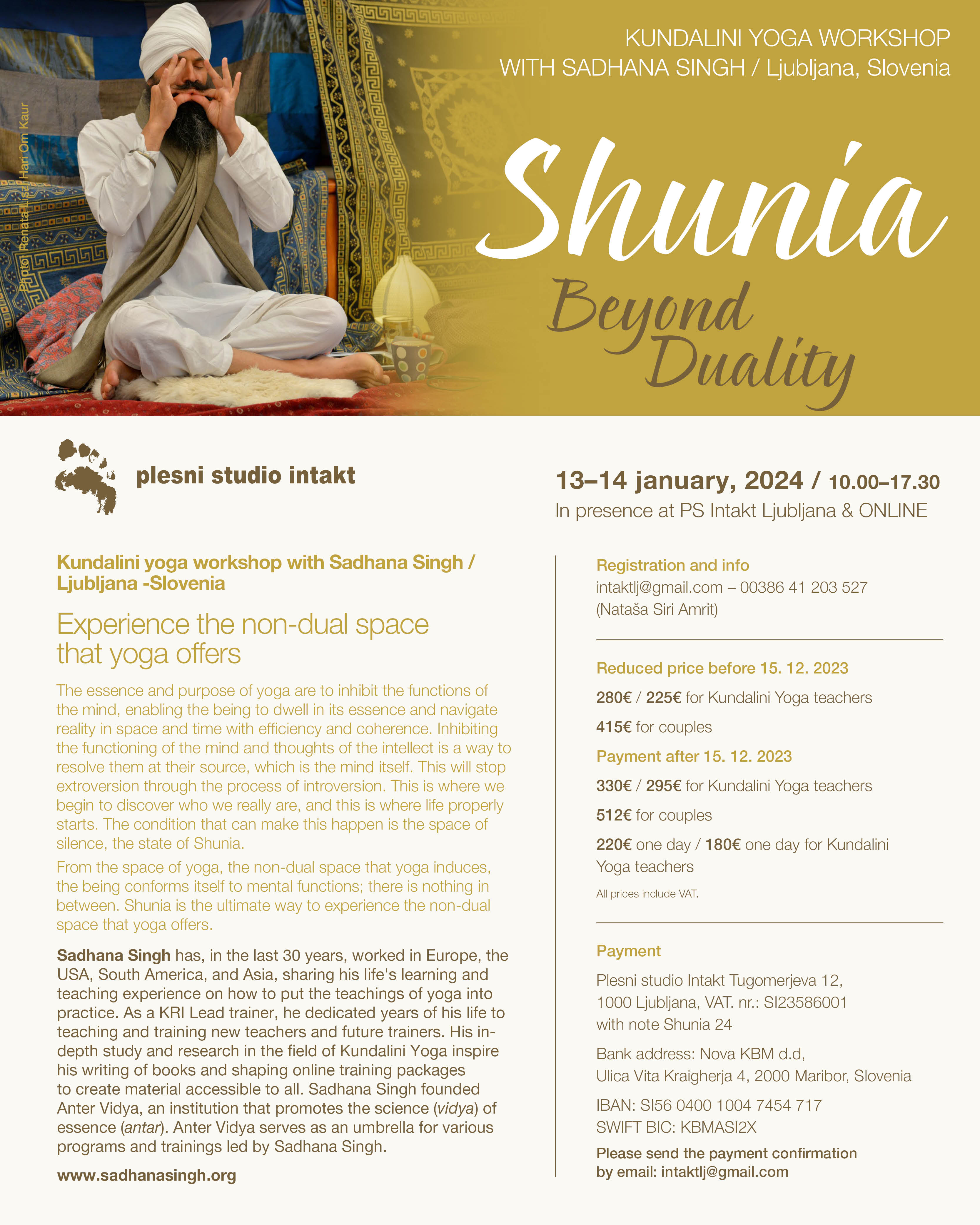 Early-bird by 15. 12. 2023: 280€ (255€ for Kundalini Yoga teachers), 415€ for couples